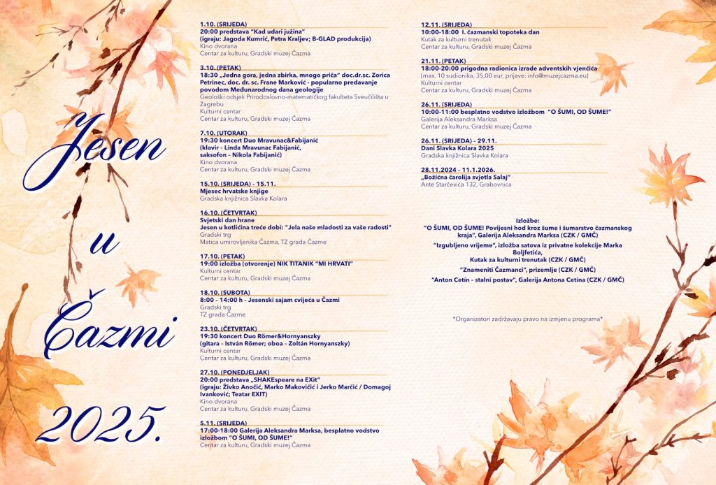 Organizatori pozivaju sve posjetitelje da prate najave događanja jer zadržavaju pravo na eventualne izmjene programa. Jesen u Čazmi 2025. obećava bogat kulturni ugođaj, kreativne radionice i nezaboravne trenutke za sve ljubitelje umjetnosti i tradicije.