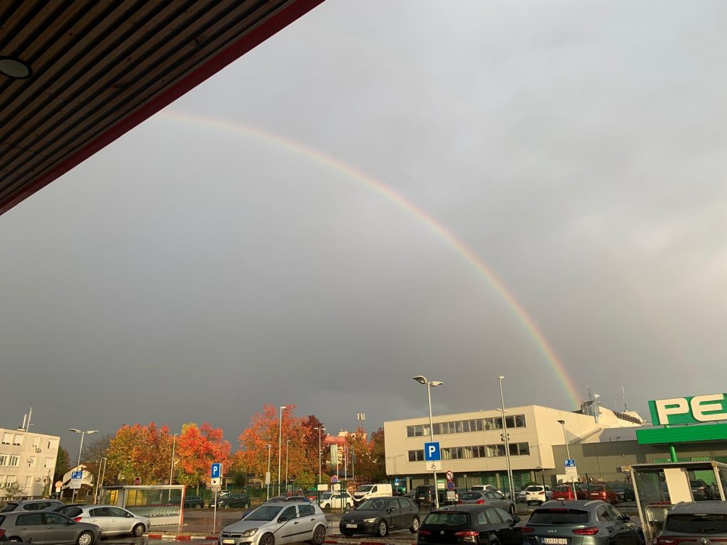 Zrake sunca koje su se probile kroz oblake u kombinaciji s kapljicama kiše stvorile su savršene uvjete za ovu čaroliju boja. Duga se protezala iznad grada poput mosta, a na trenutak je zaustavila svakodnevnu žurbu i podsjetila prolaznike koliko priroda zna biti veličanstvena.