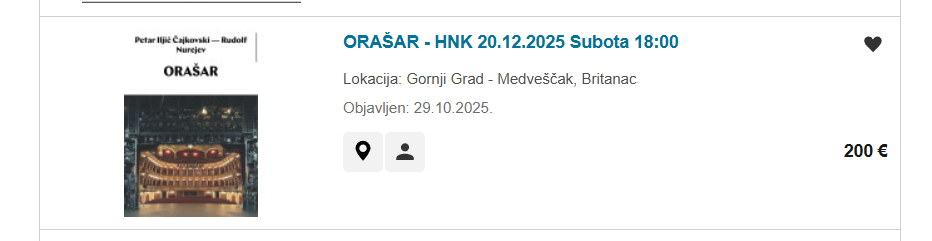 Prosinac je tradicionalno rezerviran i za Orašara, koji se održava u nekoliko termina, a sve ulaznice rasprodane su gotovo trenutačno. Tijekom online prodaje sustav je pao, a gužve pred HNK bile su ogromne. Na popularnom internet oglasniku Njuškalo.hr ulaznice se sada mogu pronaći po cijenama od 75 do čak 200 eura, ovisno o datumu i poziciji u dvorani.