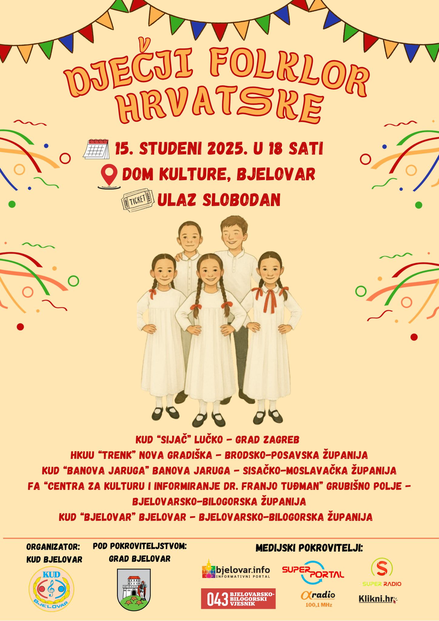 Bjelovar će u subotu, 15. studenog postati središte dječje folklorne radosti. U Domu kulture s početkom u 18 sati održat će se manifestacija “Dječji folklor Hrvatske”, koja okuplja najmlađe čuvare tradicije iz različitih dijelova zemlje.