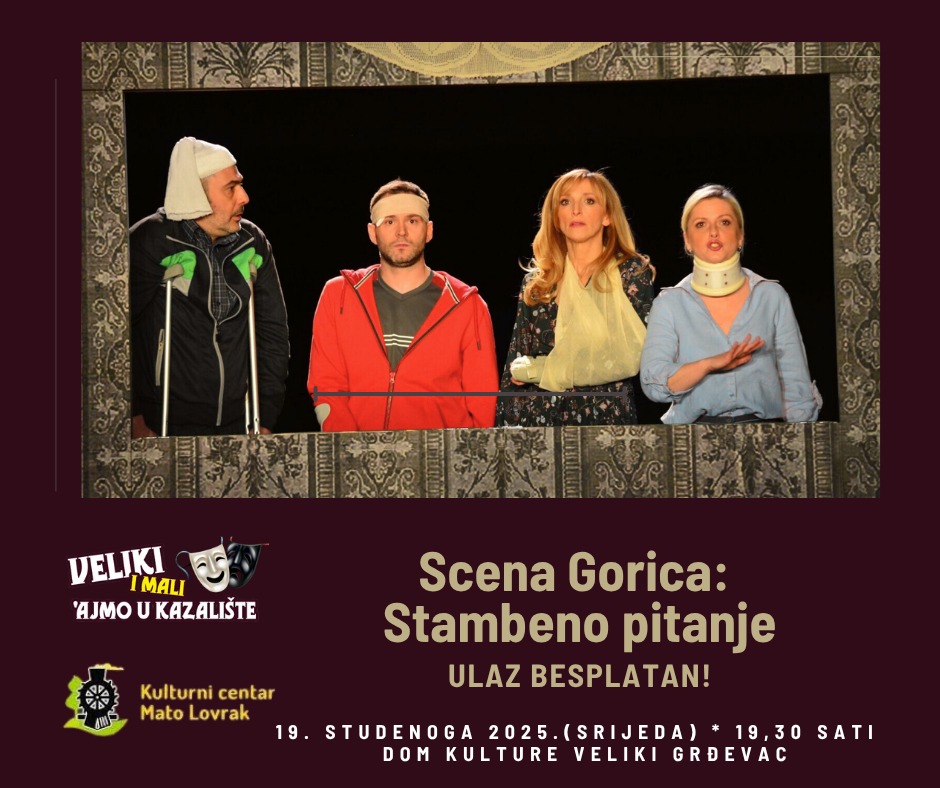 Veliki Grđevac ugostit će novu kazališnu poslasticu: predstavu “Stambeno pitanje” u izvedbi Scene Gorica. Publika će ovu komediju, koja na duhovit način progovara o svakodnevnim problemima, apsurdima i izazovima modernog života, moći pogledati potpuno besplatno.