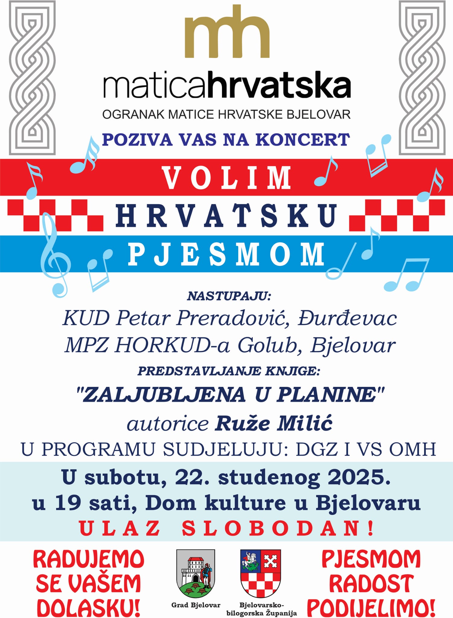 Bjelovar će ove subote, 22. studenog 2025., u 19 sati biti domaćin posebnog kulturnog događanja u Domu kulture, kada će ljubitelji glazbe i književnosti moći uživati u koncertu i promociji knjige. Ovaj događaj organizira Ogranak Matice hrvatske Bjelovar, pod nazivom “Volim Hrvatsku pjesmom”. Ulaz je slobodan za sve posjetitelje.