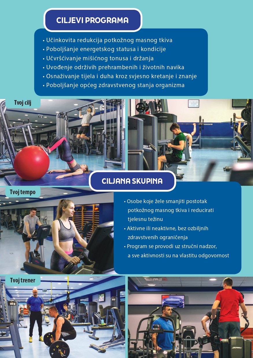 Bez obzira jeste li aktivni ili pak vodite sjedilački način života, ovaj program namijenjen je za sve one koji žele smanjiti udio masnog tkiva, poboljšati kondiciju, ojačati mišićni tonus i usvojiti zdravije navike. Kako je riječ o strukturiranom programu pod stručnim nadzorom kineziologa i nutricionista, nije potrebno prethodno iskustvo u vježbanju, važna je jedino spremnost na predan rad.