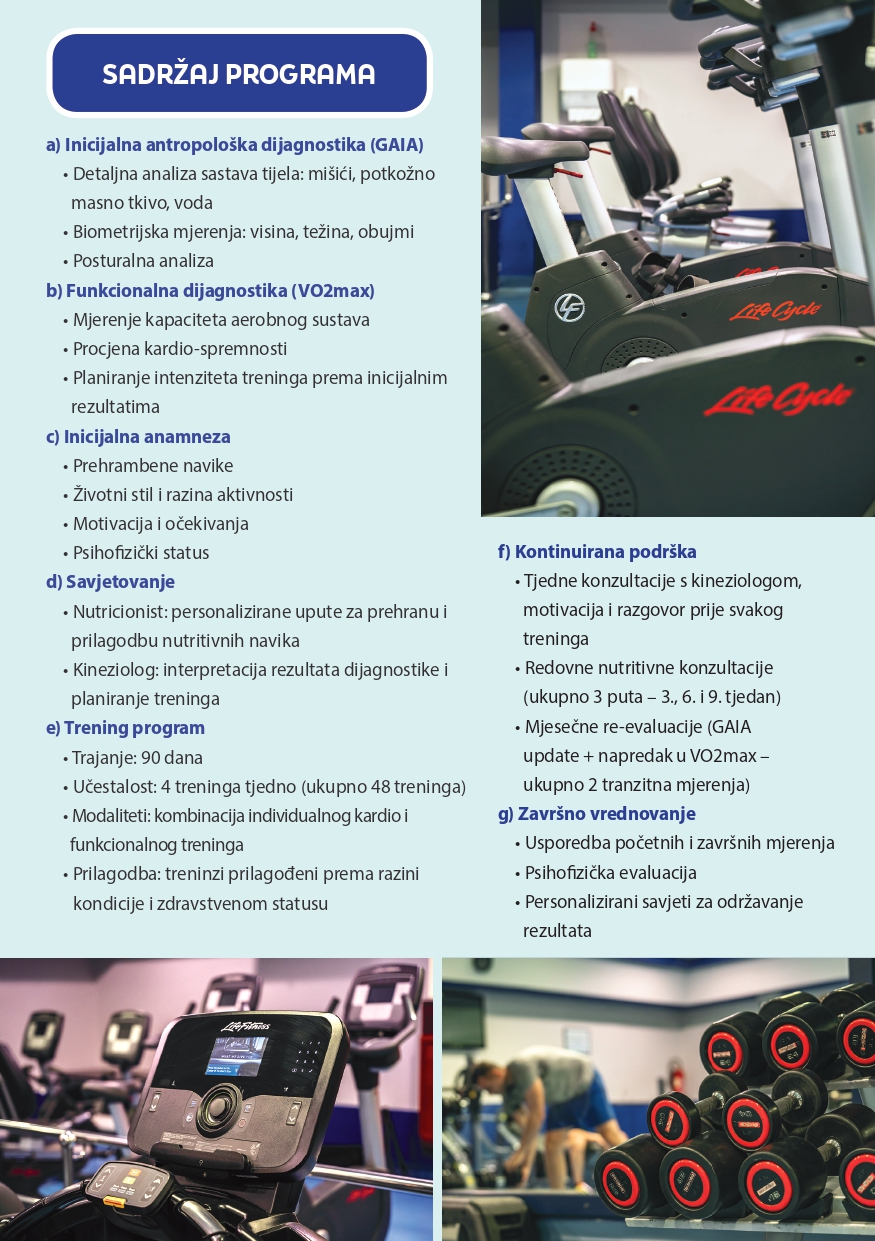 Ono što se posebno ističe jest rad jedan na jedan s osobnim trenerom, a svaki polaznik prolazi detaljnu početnu dijagnostiku. Analiza sastava tijela, posturalna procjena, mjerenje VO2max kapaciteta te razgovor o prehrambenim navikama i životnom stilu služe kao temelj za izradu potpuno individualiziranog plana. Trening obuhvaća četiri susreta tjedno te ukupno 48 treninga, koji kombiniraju kardio i funkcionalne vježbe prilagođene početnom stanju i zdravstvenom statusu sudionika.
