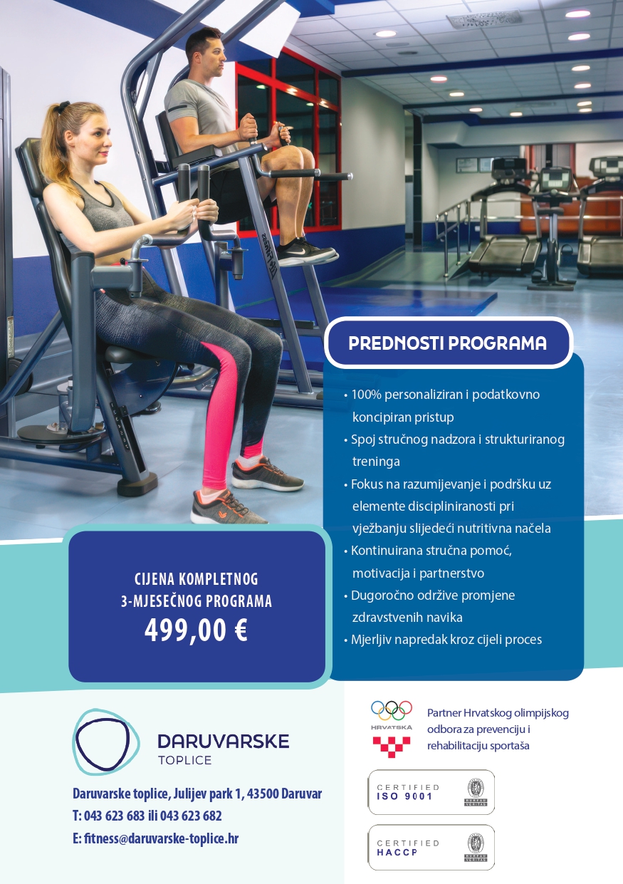 “Vrlo nam je bitan individualni pristup, stoga valja istaknuti kako fitnes treneri rade udvije smjene, pa se programu možete priključiti u vrijeme koje vam najbolje odgovara s obzirom na organizaciju vaših dnevnih obaveza i aktivnosti tijekom radnog tjedna”, poručuju iz Daruvarskih toplica.