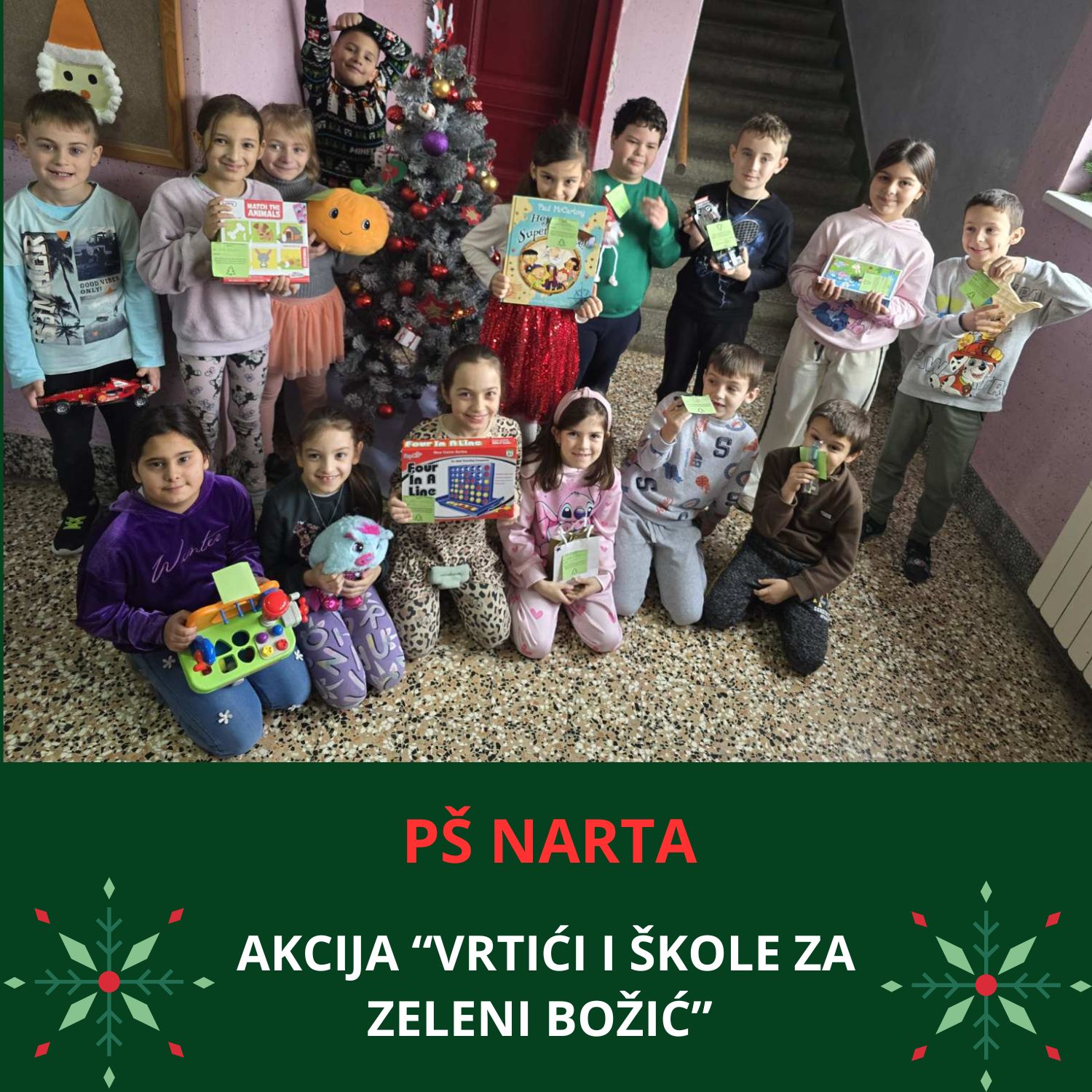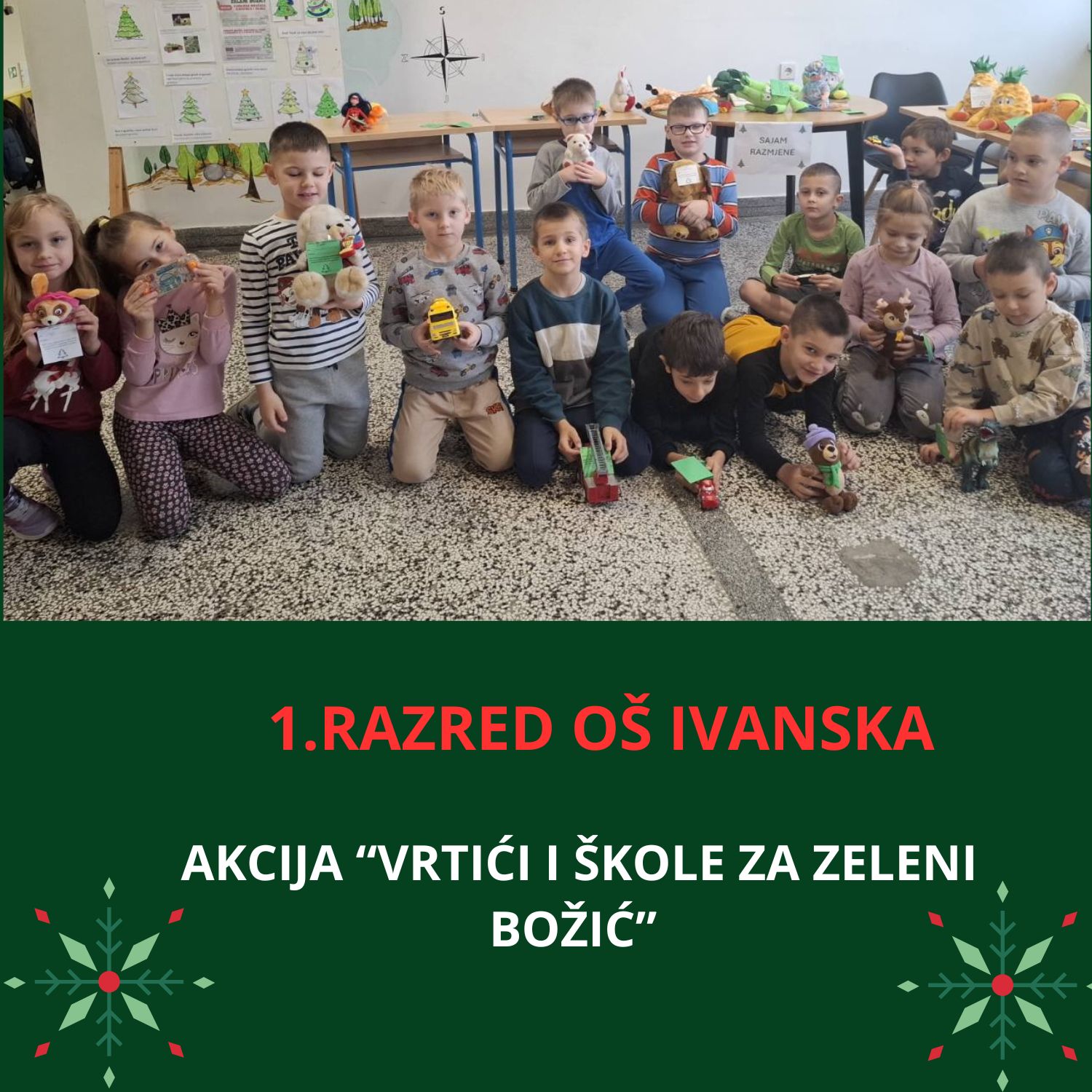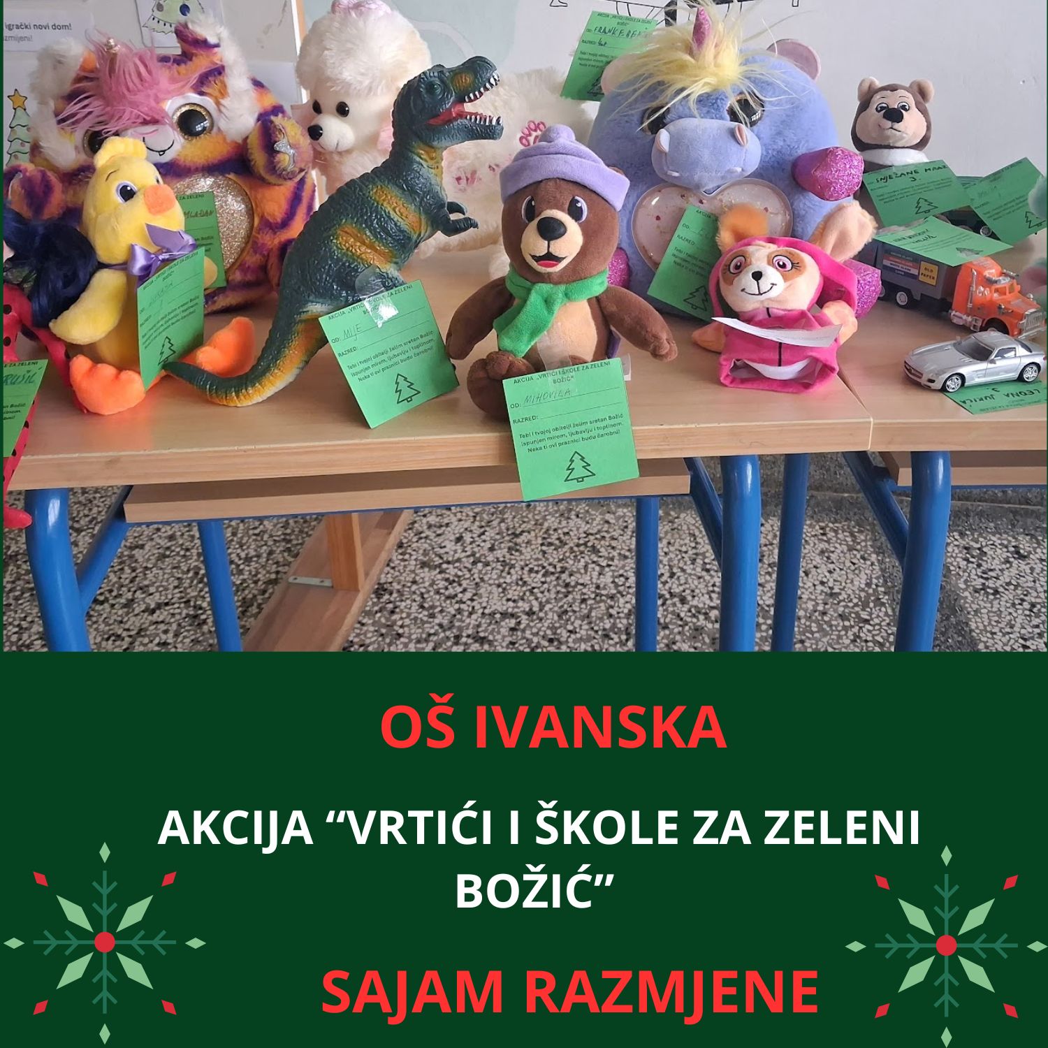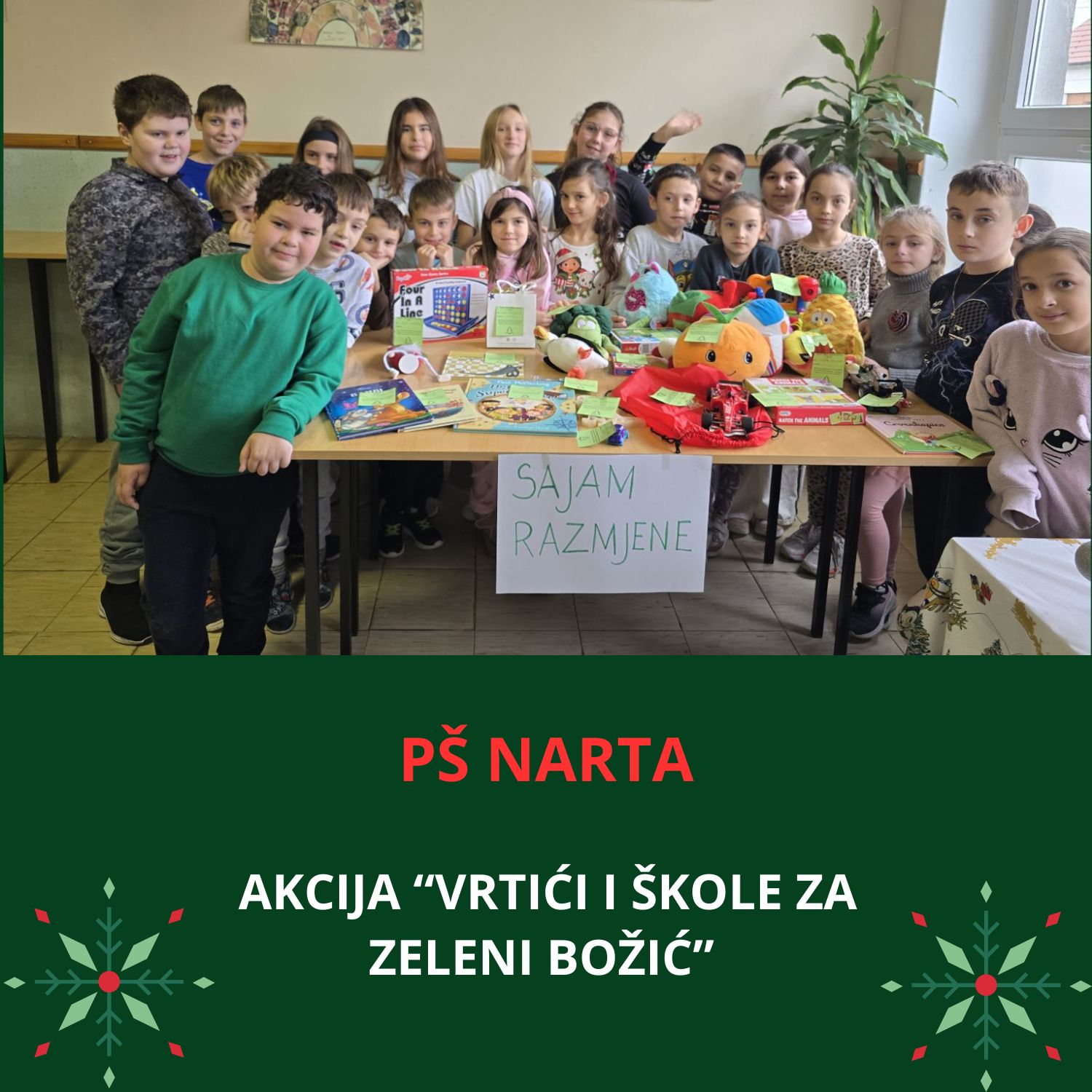 Osnovna škola Ivanska i Područna škola Narta ovih dana odišu posebnom atmosferom, jer su tamo učenici od 1. do 4. razreda sudjelovali u Sajmu razmjene igračaka, slikovnica i knjiga u sklopu akcije “Vrtići i škole za zeleni Božić”. Bio je to način da podrže Udrugu „Zeleni klik!“ iz Zagreba koja će u ime svih uključenih u ovu akciju, kao božićni poklon, Udruzi za promicanje inkluzije iz Brezovice koja pomaže osobama s intelektualnim teškoćama pokloniti organski vrt s povišenim gredicama.
