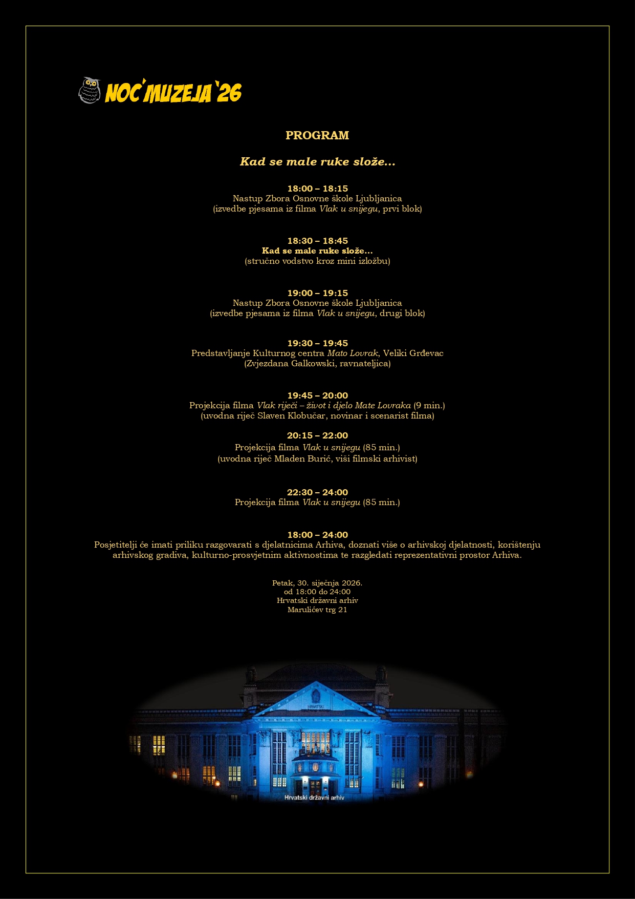 Tim povodom Hrvatski državni arhiv pripremio je izložbu arhivske građe sa snimanja filma, kroz koju će posjetitelje voditi stručno vodstvo. Program će dodatno obogatiti nastup Zbora Osnovne škole Ljubljanica, dok posebno mjesto u večeri zauzima Kulturni centar “Mato Lovrak”.