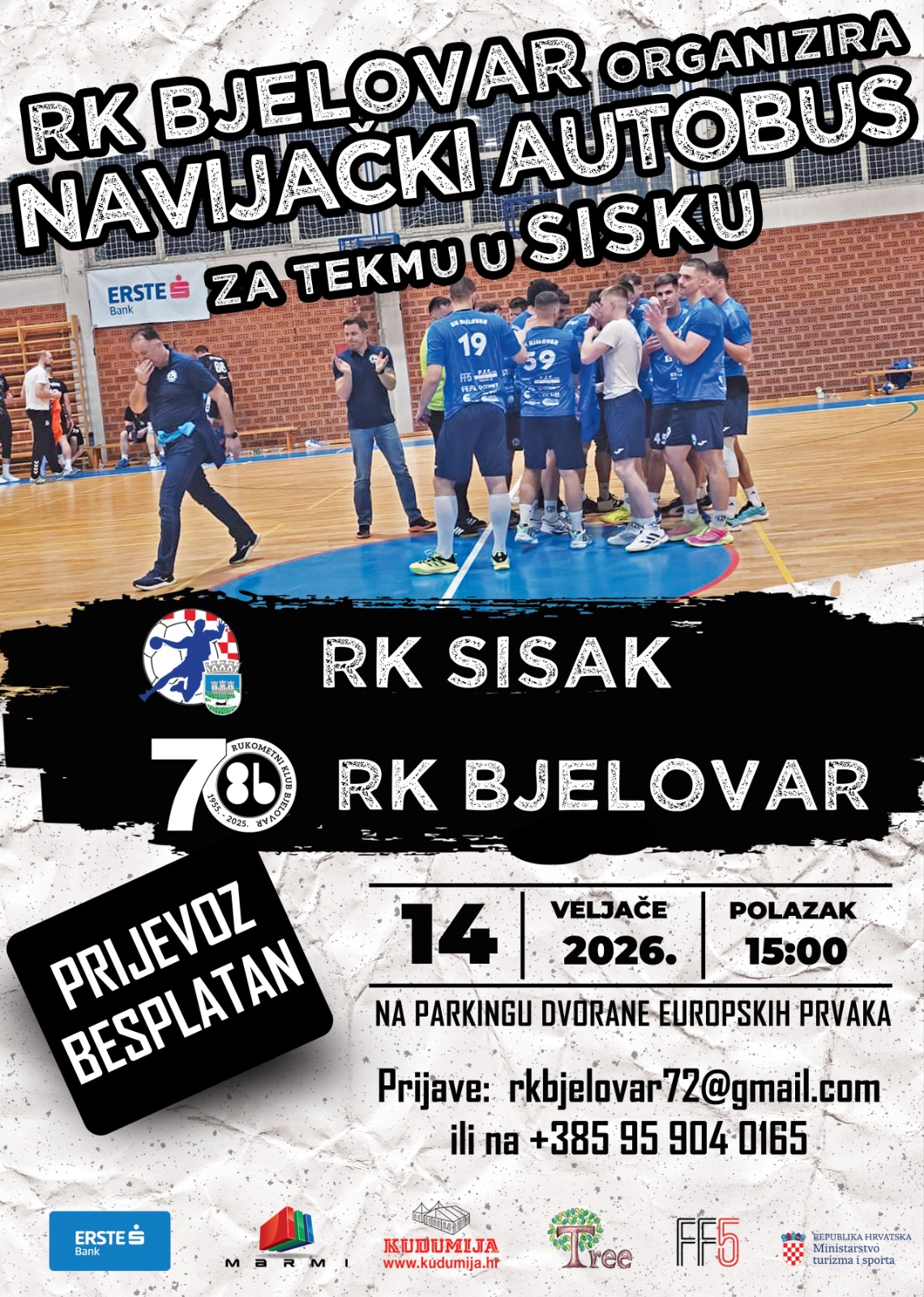 Jer, organiziran je navijački autobus koji iz Bjelovara (ispred Dvorane europskih prvaka) kreće tri sata prije početka – u 15 sati. Prijevoz je besplatan, a svi zainteresirani se mogu javiti na e-mail adresu: rkbjelovar72@gmail.com ili broj mobitela: 095/904-0165. To do popune autobusa (50 mjesta). Shodno svemu, ukoliko su vam srcu prirasli naši „Kesizupci“ ne dvoumite se. Prijavite se što prije, zauzmite mjesto u autobusu te svi zajedno, od početka do kraja bodrimo svoje ljubimce. Pokažimo momcima da smo uvijek uz njih. IZNAD SVIH, RK BJELOVAR!