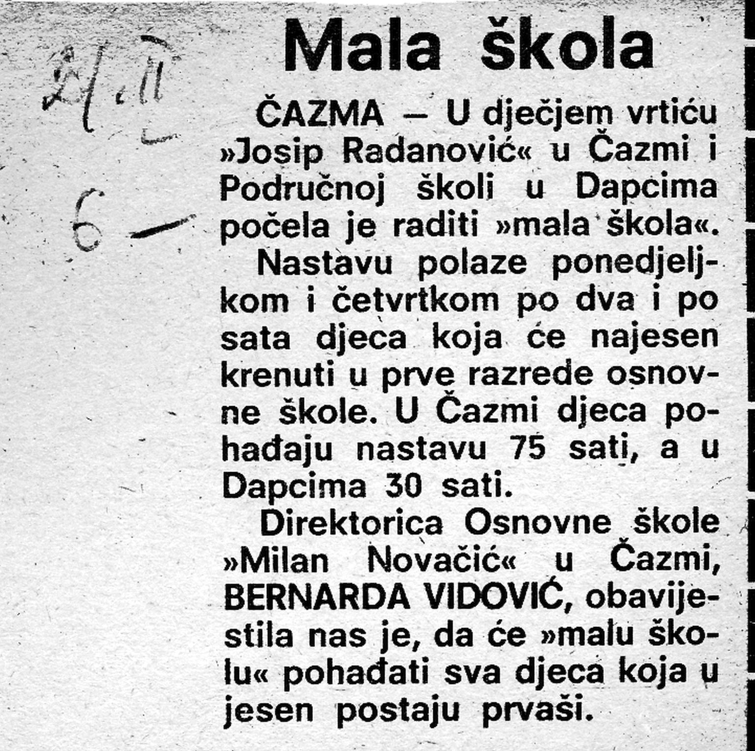 U rujnu 1965. dolazi do organizacijskih promjena – Dječje zabavište „Josip Radanović“ pripojeno je Osnovnoj školi „Milan Novačić“ Čazma radi objedinjavanja odgojnog rada i stručnog nadzora. Tijekom 1980-ih vrtić pohađa stotinjak djece, raste i broj zaposlenih, no prostorni uvjeti postaju sve veći izazov jer je prvotna zgrada bila predviđena za pedesetak polaznika.