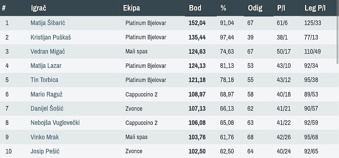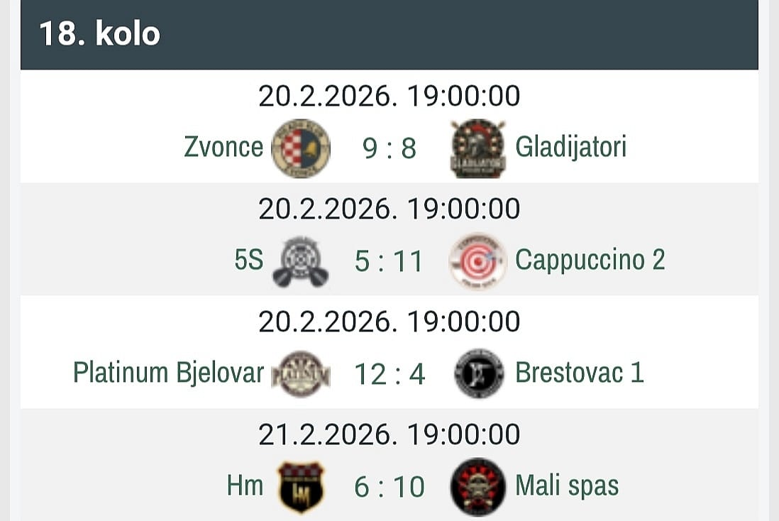 Bjelovarski Platinum još je jednom ove sezone dokazao da je nedodirljiv. Naime, ovoga je puta kapitulaciju morala potpisati prva ekipa Brestovca, i to krajnjim ishodom 12:4. Drugim riječima, ovdje govorimo o najuvjerljivijoj prezentaciji kola s tim da su predvodnici bili Lazar (3:0), Franjić (2:0) te Šibarić (2:1). Time je meč vrlo brzo usmjeren ka domaćinu, odnosno, razlika je za goste postala nedostižna. Valja naglasiti da je Brestovac nastupio sa samo tri pikadista pa i u tome možemo tražiti razlog ovakvog rezultata. Jer, jasno je kako je navedeno poraženima otežalo zadatak protiv ionako favoriziranih platinumovaca. Kako bismo bili potpuno precizni, reći ćemo vam da je kod Brestovčana s 3:1 raspoložen bio samo Anđal.
