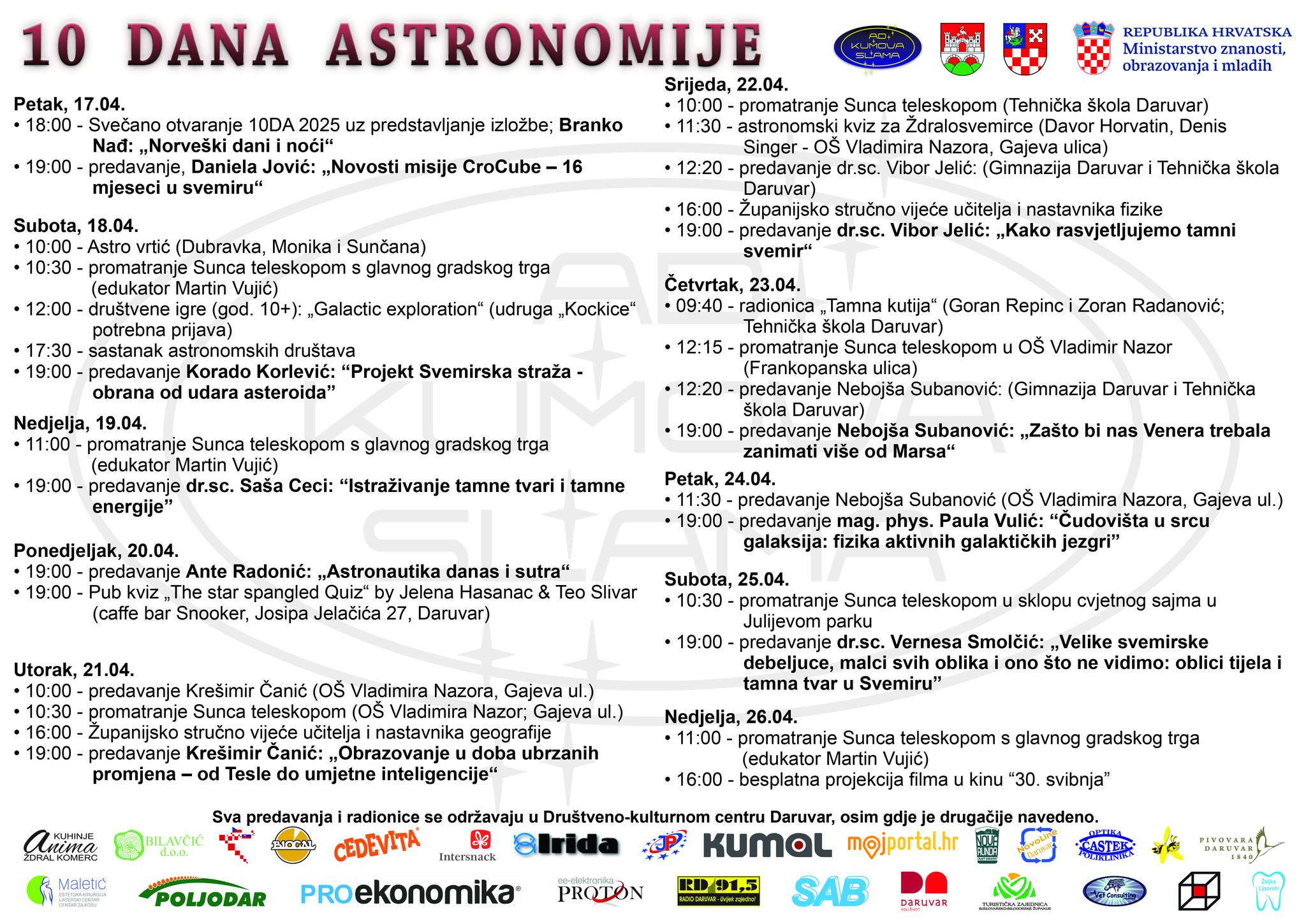 – Ja se nadam da ćemo imati lijepo vrijeme jer posljednjih par godina tako nije bilo i nismo mogli upotrebljavati teleskope za vrijeme ove manifestacije. Svečano otvorenje je u petak, 17. travnja u 18 sati. Svakoga dana od 19 sati, u Društveno kulturnom centru Daruvar održavat će se prigodna predavanja – najavljuje tajnik Astronomskog društva Kumova Slama, Toni Boroš.