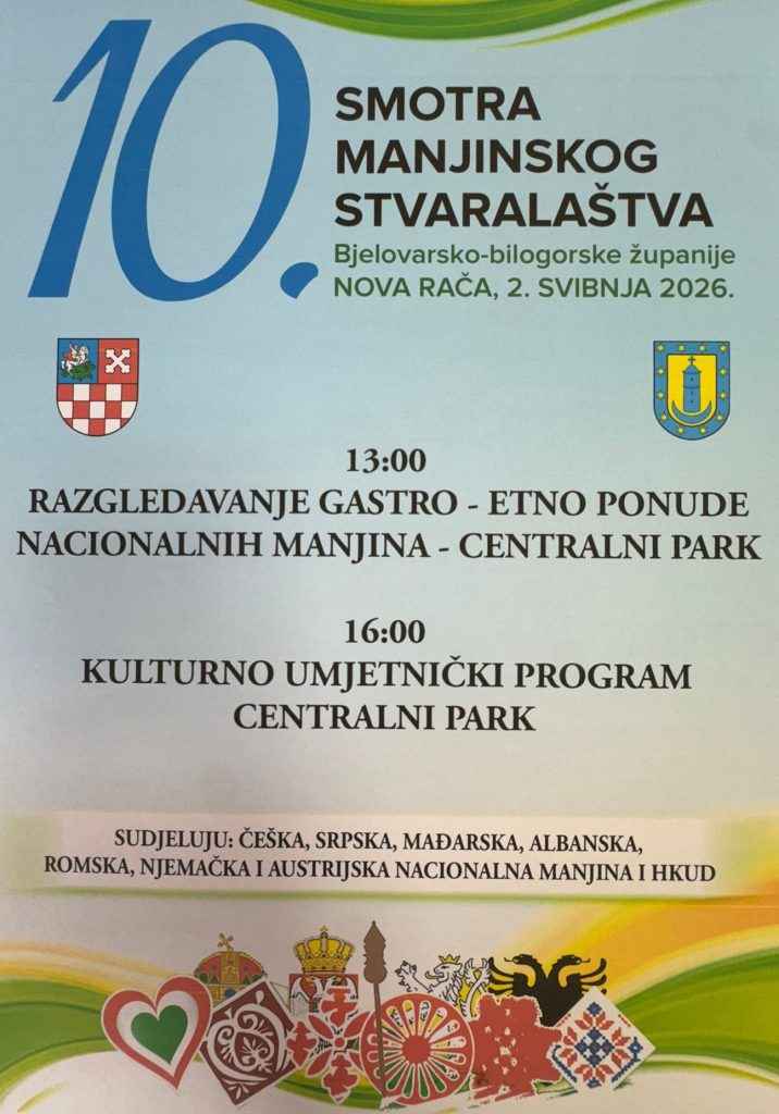 Bjelovarsko – bilogorska županija početkom svibnja ponovno slavi bogatstvo različitosti i zajedništva. U subotu, 2. svibnja, u Novoj Rači održat će se 10. Smotra manjinskog stvaralaštva, manifestacija koja kroz kulturu, gastronomiju i druženje predstavlja tradiciju nacionalnih manjina koje žive na području županije.