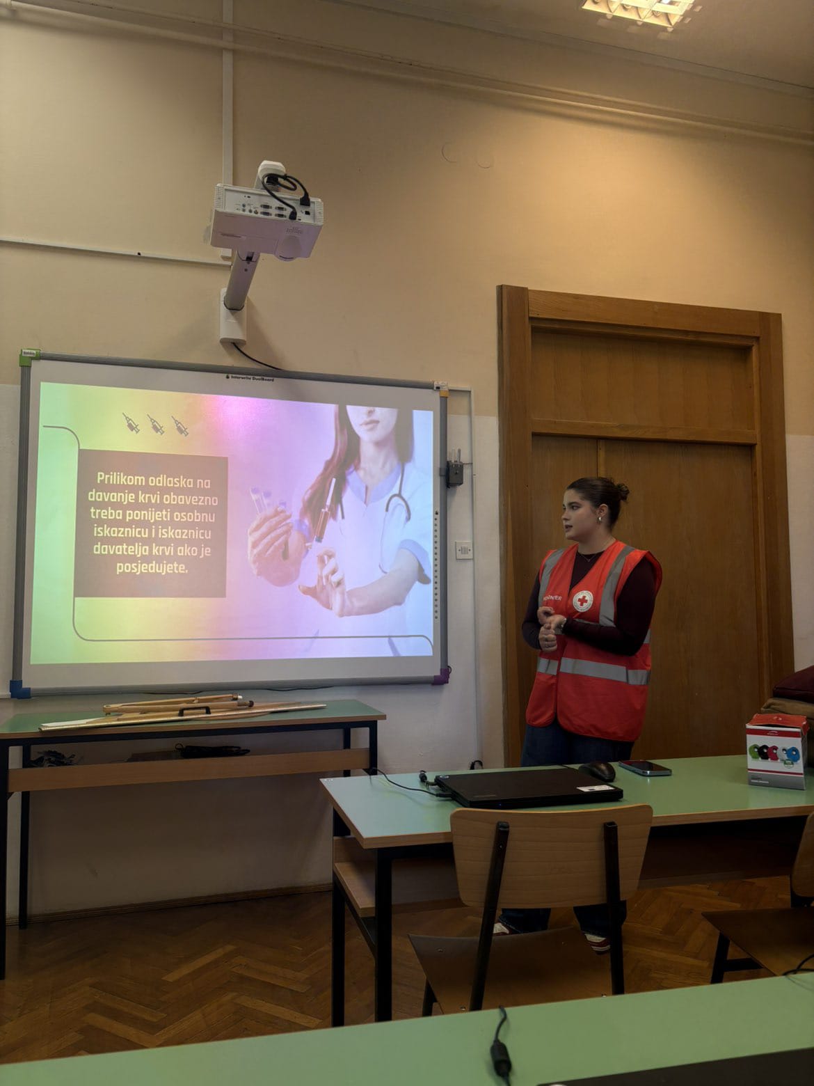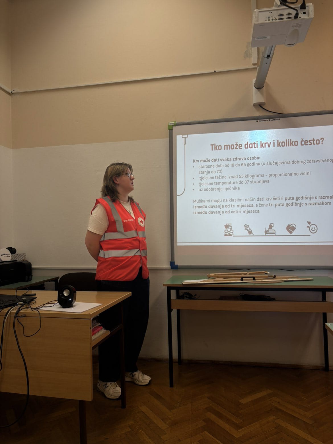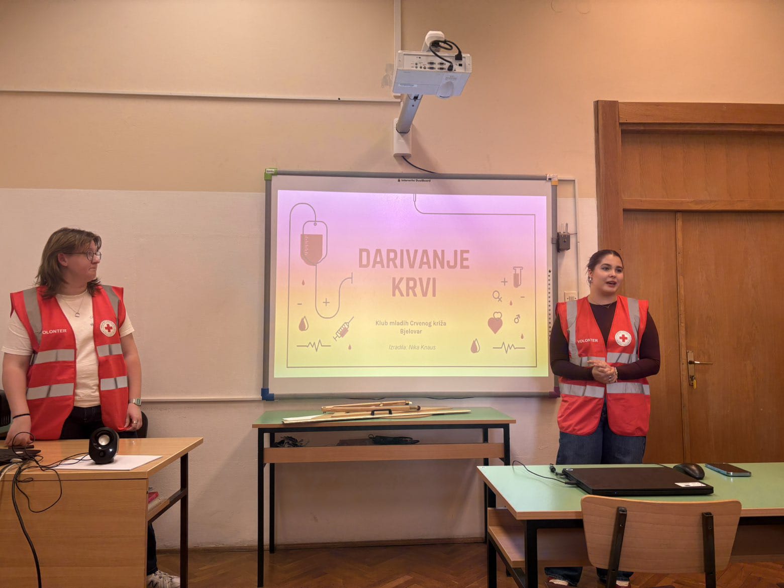 Učenice 4. a razreda Eva Caktaš i Ema Legin, uz asistenciju djelatnice GDCK Bjelovar, svoje vršnjake u Gimnaziji Bjelovar, ali i u Tehničkoj školi Bjelovar informiraju o tome kako se postaje dobrovolji davatelj krvi, tko sve može darivati krv, koliko često osoba može darivati krv te koji su razlozi, tj. prepreke privremenog odbijanja davatelja. Učenice odgovaraju i na mnoga druga pitanja vezana za darivanje krvi.