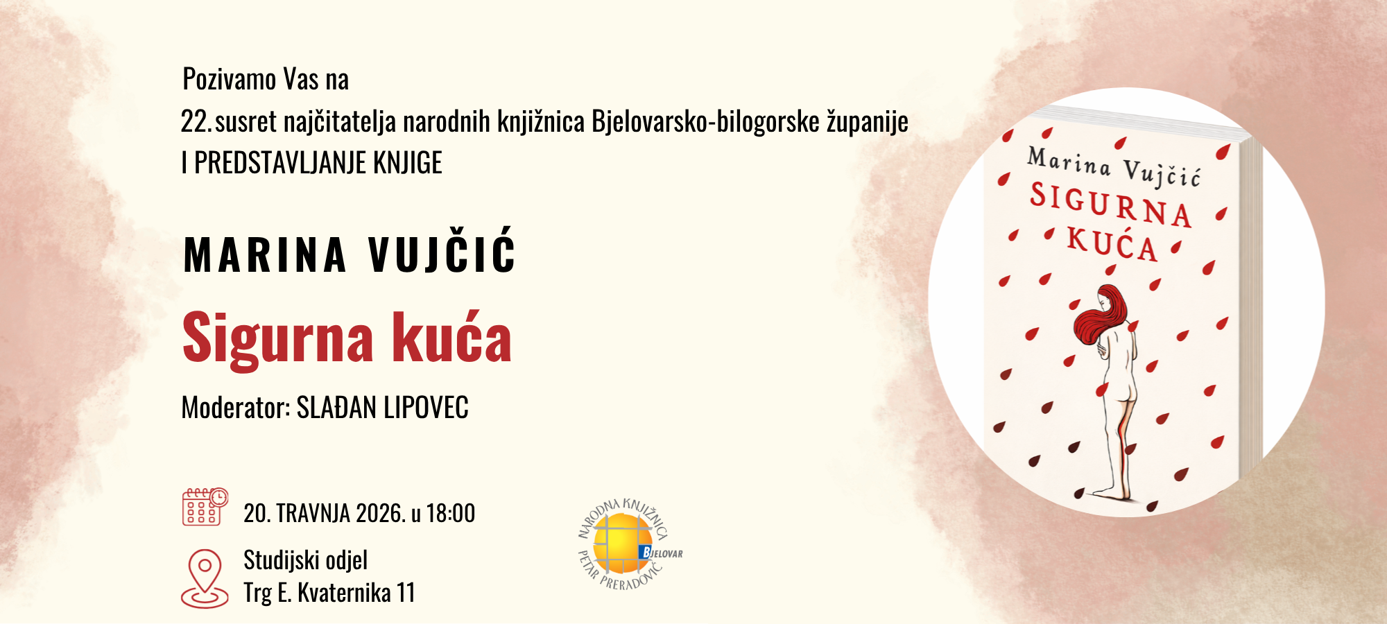 Književna večer održat će se u ponedjeljak, 20. travnja, s početkom u 18 sati na Studijskom odjelu knjižnice, na adresi Trg E. Kvaternika 11. Posjetitelje očekuje razgovor s autoricom, predstavljanje njezina rada te prilika za izravan susret i razmjenu dojmova.