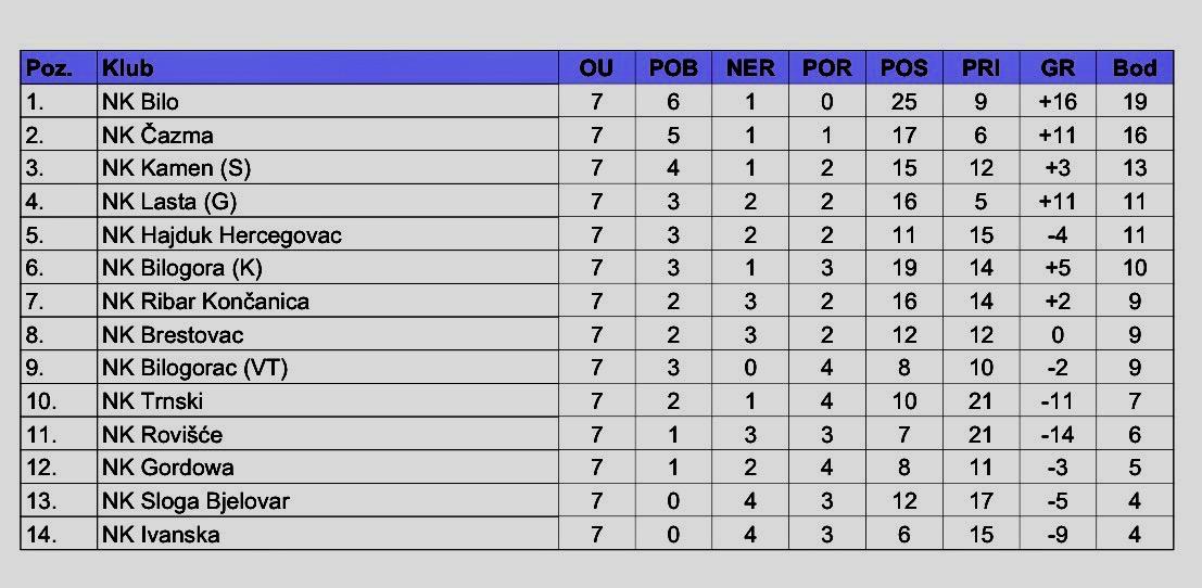 Dakle, ovo je još jedan dokaz da se bodovi nikad ne smiju upisivati unaprijed. U ovaj dio priče spada i meč odigran u Rovišću. Jer, tamo je od istoimenog domaćina pokleknula Bilogora iz Kapele – momčad koja u ovom prvenstvu nikako ne uspijeva doći do brze, okomite, pragmatične igre koja ju je krasila u prošloj sezoni. Jednostavnije rečeno, očigledno će trener Marko Balažić morati dodatno upregnuti svoje snage pa možda čak i „izmiješati“ karte. Sve u svemu, nestrpljivi smo prije budućih „loptanja“ između kaznenih prostora, a vjerujemo da je tako i kod vas navijača. Zaključno, pogledajte trenutno stanje ljestvice……