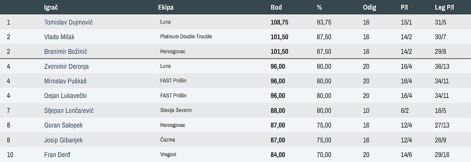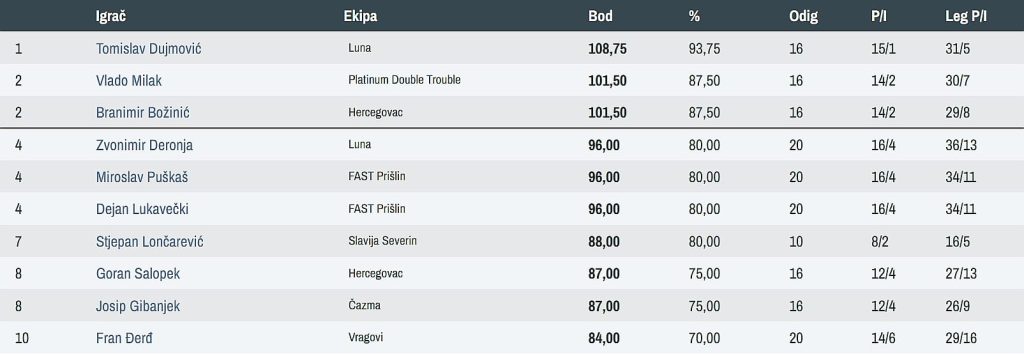 Evo i najboljih imena pete runde….. prije svega, Milak iz Platinum Double Troublea. Pikadist je to koji se istaknuo omjerom 4:0 drugi tjedan zaredom. Donijelo mu je to diobu drugog mjesta na MVP ljestvici s Božinićem (igrač Hercegovca). Uspjehom poput Milakova može se pohvaliti Čazmanac Josip Gibanjek. Pojednostavljeno, i Gibanjek je drugi tjedan zaredom bio besprijekoran (4:0). Lunin Dujmović i dalje je vodeći na MVP ljestvici uz napomenu da FAST Prišlin drži vodstvo u ekipnom ukupnom poretku. Drugi su Gladijatori II, dok je treći Hercegovac sa susretom manje. I na kraju još kažimo da u petak, 10. listopada kreće Druga pikado liga BBŽ-a, dok ćemo od nedjelje, 12. listopada uživati i u uzbuđenjima Steel lige. Riječ je o klasičnom pikadu.