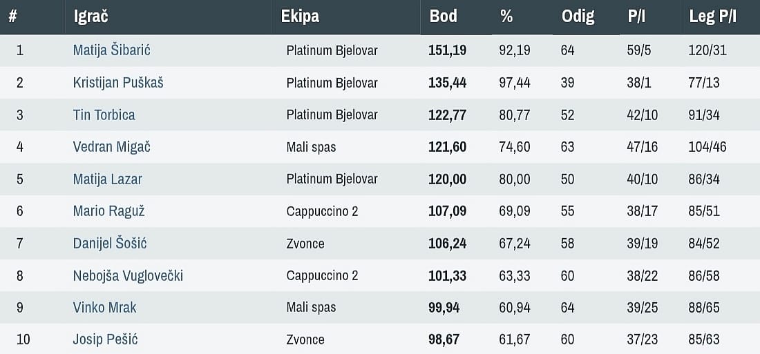 Zaključno, istaknuti igrači. Zapravo, u ovom slučaju samo jedan što je prava rijetkost. Njegovo ime je Kristijan Puškaš iz bjelovarskog Platinuma koji se može pohvaliti s besprijekornih 4:0.