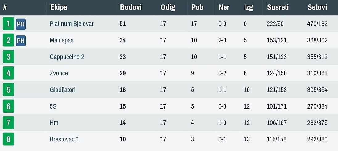 Ako ste mislili da je vrhunac dramatike dosegnut u Brestovcu i Cappuccinu prevarili ste se. Naime, najdramatičniji meč bio je onaj između Gladijatora i „spasitelja“. U konačnici 8:9 za goste, i to nakon domaćeg vodstva 8:5. Najbolji „gladijator“ Bunčić s 3:1, Cindrić i Tomić 2:2. No, odlučujući faktor bio je gostujući trojac Perković/Migač/Mrak. Kako bismo bili potpuno precizni reći ćemo – Perković i Migač 3:1, Mrak 2:2 pa onda i 0:2 u igri parova. Za to su zaslužne kombinacije Migač/Mrak, Perković/Sokolović. Dakle, super važni bodovi otišli su u Mali Spas. Drugo mjesto je sačuvano, a hoće li biti do kraja vidjet ćemo.