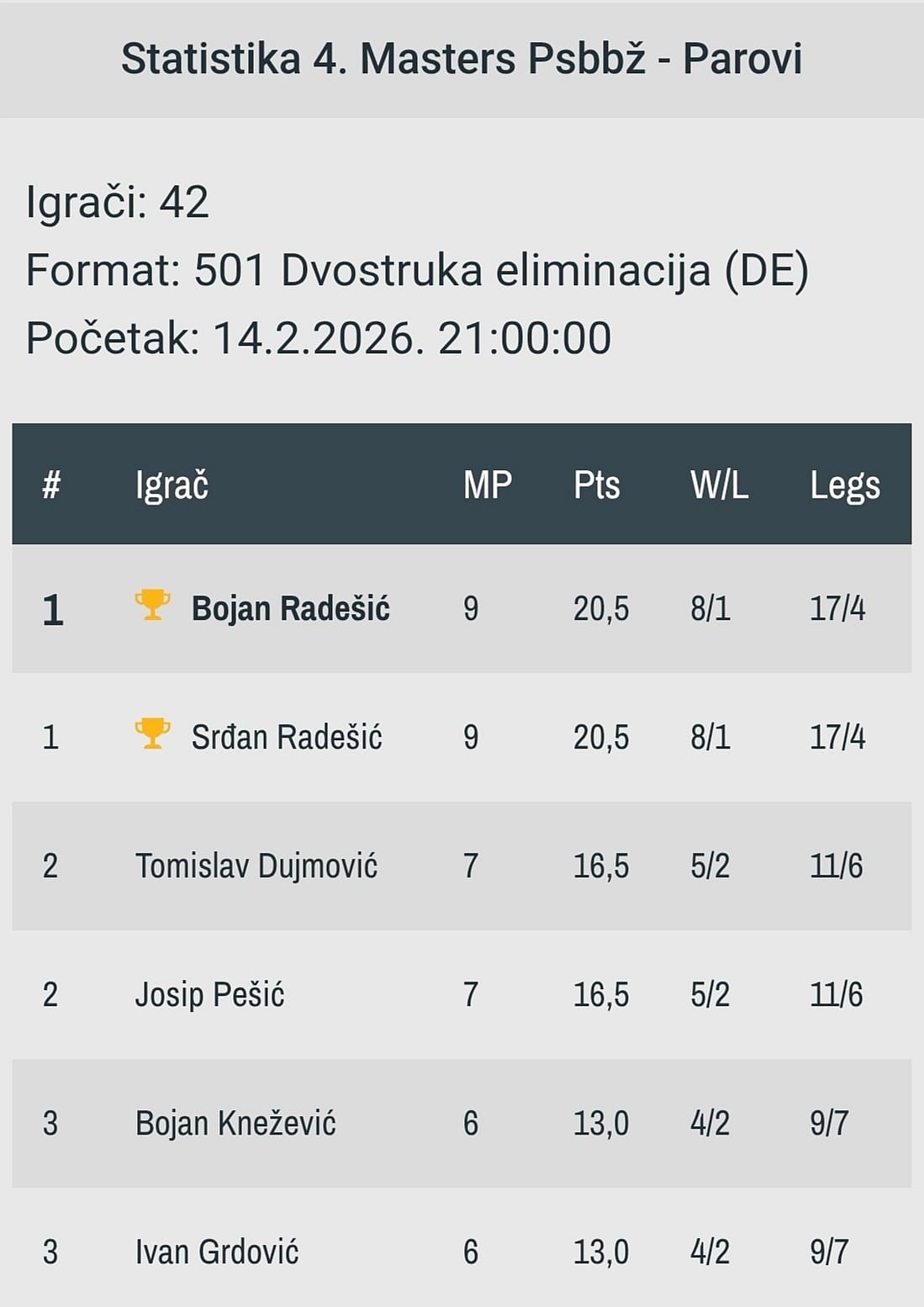 Kristijan Puškaš pobjednik četvrtog pikado Mastersa PSBBŽ-a, parovi braći Radešić