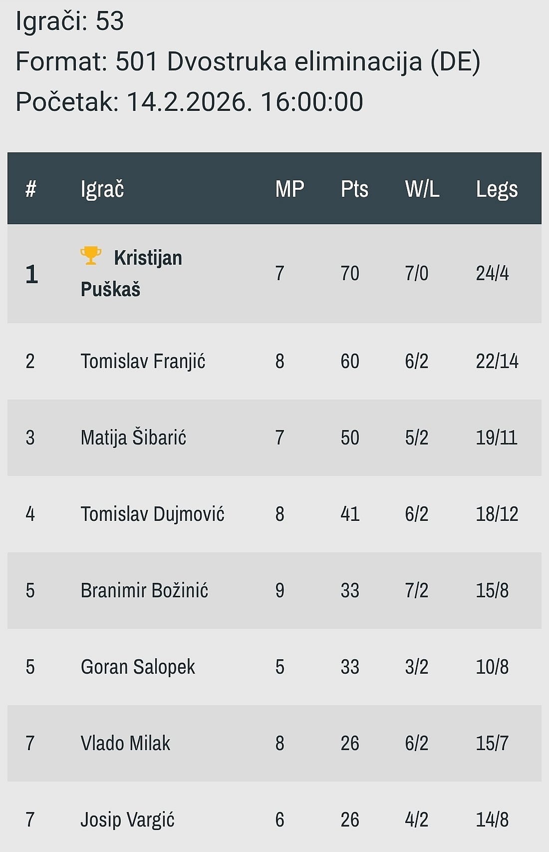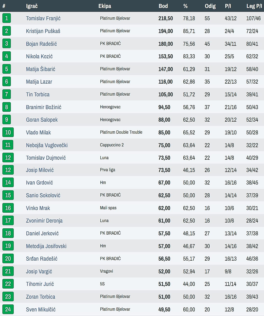Naposljetku, najviše koncentracije, preciznosti te sigurnosti u završnicama imao je Kristijan Puškaš – član Pikado kluba Platinum Bjelovar. Dakle, on je pobjednički pehar kući ponio posve zasluženo, dok su mu na pobjedničkom postolju društvo pravili Tomislav Franjić i Matija Šibarić. Zanimljivo, i ovdje govorimo o igračima bjelovarskog Platinuma. Drugim riječima, potvrđena je tako odlična forma prvaka ranije spomenute Druge pikado lige PSBBŽ-a pa se sada, uz čestitke možemo samo nadati da će naši momci na najvišoj mogućoj razini biti i na klupkom državnom prvenstvu.