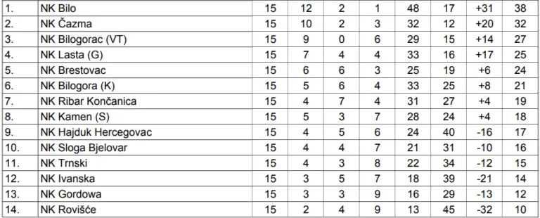 Rezultati su ovo koji nas dovode do novog kurioziteta. Naime, domaće momčadi postigle su tek pet pogodaka (to im je bilo dovoljno za svega tri boda), dok se gosti mogu pohvaliti s 14 egzekucija, odnosno 15 „uknjiženih“ bodova. Još kraće rečeno – okupljeni navijači diljem županije vidjeli su 19 golova. Primat i dalje drži pisančansko Bilo (38 bodova), drugi su Čazmanci s 32, treći NK Bilogorac iz Velikog Trojstva do sada ih je skupio 27, gudovačka Lasta četvrta je s 25, a samo bod manje, dakle 24 ima peti, u ovom prvenstvu odlični Brestovac. S druge strane ljestvice također gužva s tim što se u najnezavidnijoj situaciji nalaze 12. Ivanska, 13. Gordowa i 14. Rovišće.