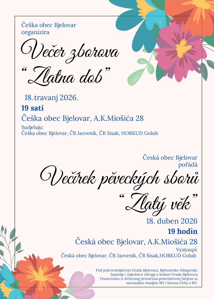 U organizaciji Češke obeci Bjelovar, u subotu, 18. travnja 2026. godine, s početkom u 19 sati, održat će se večer zborova pod nazivom „Zlatna dob“. Događaj će se upriličiti u prostorijama Češke obeci Bjelovar, na adresi A. K. Miošića 28.